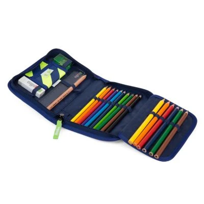 Ergobag Mäppchen gefüllt 22-tlg. – 17 Stifte – Radiergummi – Lineal – Spitzer – Stundenplan – abwaschbares Material – zu 100% aus gebrauchten PET-Flaschen hergestellt werden.