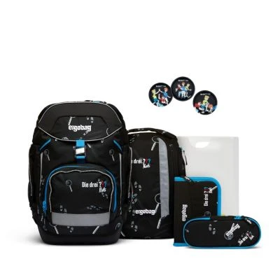 Lieferumfang: Schulrucksack, Sportbeutel, Kletties-Set (3-tlg.), Federmäppchen (22-tlg.), Schlampermäppchen, Heftbox, Lupe, drei ??? Heft
